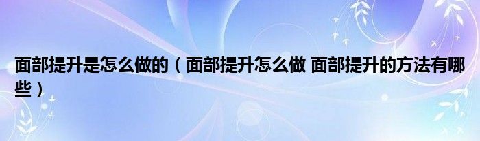 大家好,linda来为大家解答以上的问题。面部提升是怎么做的,面部提升怎么做 面部提升的方法有哪些很多人还不知道,现在让我们一起来看看吧!