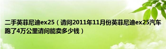 1,请问2011年11月份英菲尼迪ex25汽车跑了4万公里请问能卖多少钱:到二手车网上看看跟你同款车都卖多少,参考一下,建议你别卖给车贩子再看看别人怎么说的。