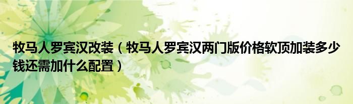 大家好,小常来为大家解答以下问题,对于牧马人罗宾汉改装,牧马人罗宾汉两门版价格软顶加装多少钱还需加什么配置很多人还不知道,今天让我们一起来看看吧!