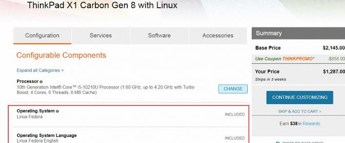 联想在今年4月宣布将在其计算机上预装Fedora OS。现在,此类设备已经可以订购和购买。下面的专有网络配置器图片显示了预装Fedora OS的价格不便宜的ThinkPad X1 Carbon Gen 8笔记本电脑,售价为2000美元(不包括促销代码的折扣)。