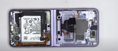 手机下半部分的内部区域有一个相当大的石墨垫,用于热管理以及第二块 2,370 mAh 电池、扬声器组件和充电端口。最后,我们来看看非常薄的柔性显示器,它位于新的和修改过的折叠铰链的顶部。结论很明确,Galaxy Z Flip3 远非一款易于修复的手机,可修复性评级为 4/10。